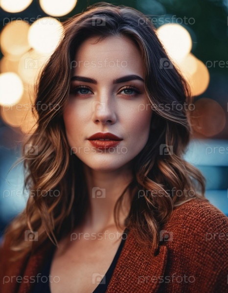Молодая американка позирует с безмятежным выражением лица, ее волосы мягко обрамляют лицо. Фон освещен теплыми круговыми огнями, создавая мечтательную атмосферу. Яркий вечер в городе. Генеративный ИИ
