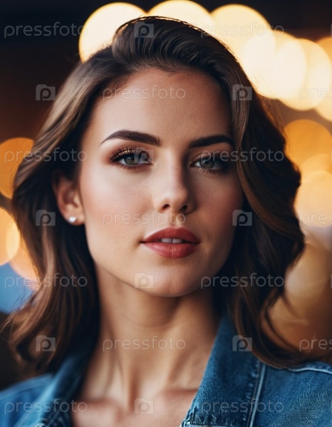 Молодая американка позирует с безмятежным выражением лица, ее волосы мягко обрамляют лицо. Фон освещен теплыми круговыми огнями, создавая мечтательную атмосферу. Яркий вечер в городе. Генеративный ИИ