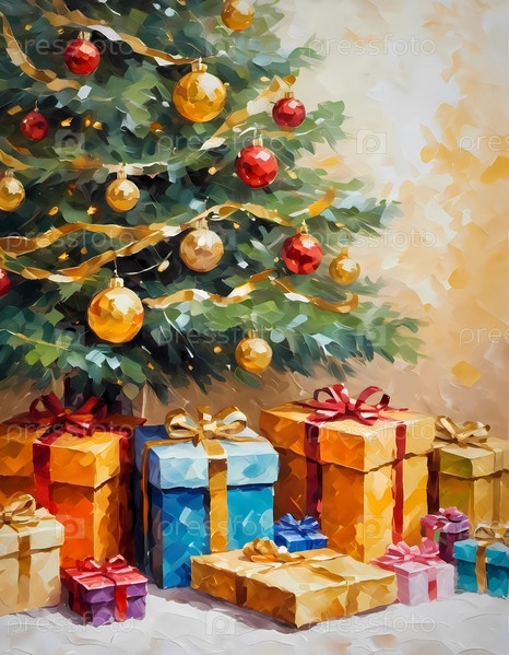 Декорированная рождественская елка, украшенная разноцветными игрушками и сложенными подарками, готова к празднованию в уютной праздничной обстановке. упакованные подарки разных цветов. Праздничная атмосфера, теплота и радость. AI
