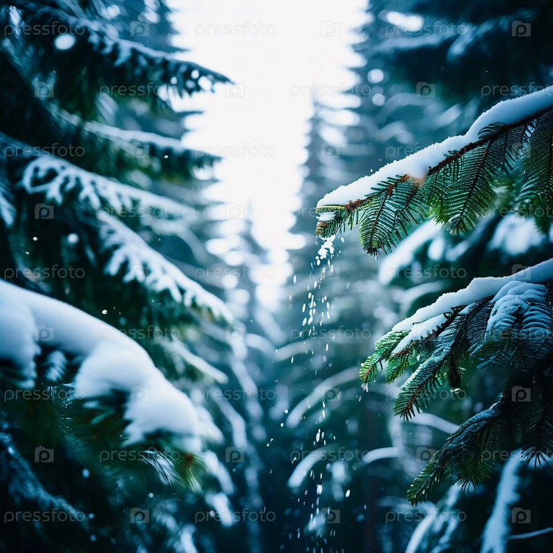 Безмятежный еловый лес, покрытый зимним снегом, демонстрирующий покрытые инеем деревья и мягкий снегопад, создающий спокойную атмосферу в мирной лесной обстановке. Генеративный ИИ