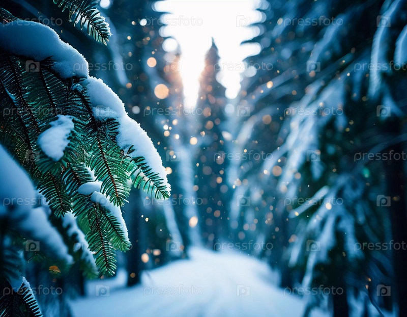 Безмятежный еловый лес, покрытый зимним снегом, демонстрирующий покрытые инеем деревья и мягкий снегопад, создающий спокойную атмосферу в мирной лесной обстановке. Генеративный ИИ
