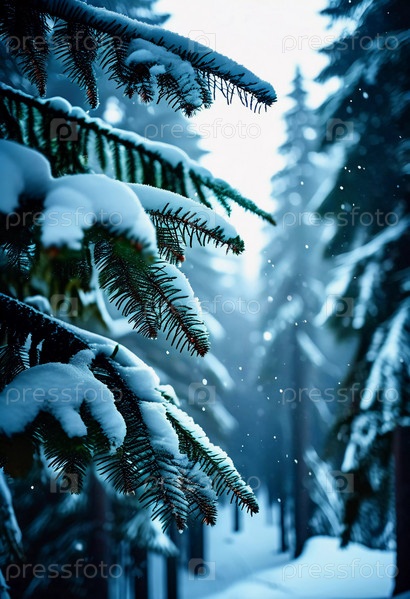 Безмятежный еловый лес, покрытый зимним снегом, демонстрирующий покрытые инеем деревья и мягкий снегопад, создающий спокойную атмосферу в мирной лесной обстановке. Генеративный ИИ