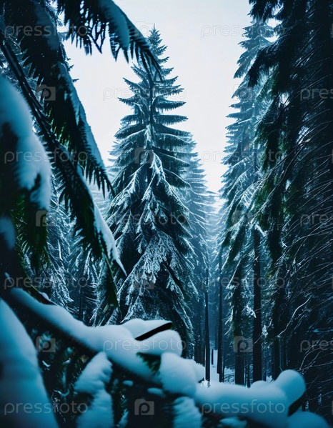Безмятежный еловый лес, покрытый зимним снегом, демонстрирующий покрытые инеем деревья и мягкий снегопад, создающий спокойную атмосферу в мирной лесной обстановке. Генеративный ИИ