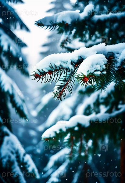 Безмятежный еловый лес, покрытый зимним снегом, демонстрирующий покрытые инеем деревья и мягкий снегопад, создающий спокойную атмосферу в мирной лесной обстановке. Генеративный ИИ