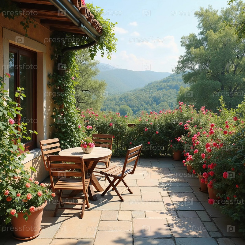 Солнечная терраса, окруженная яркими цветами, располагает к отдыху, предлагая захватывающий вид и уютное место со столом и стульями. Терраса украшена цветущими цветами и живописными горами. Генеративный ИИ