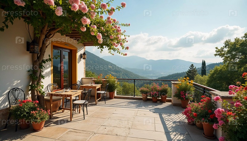 Солнечная терраса, окруженная яркими цветами, располагает к отдыху, предлагая захватывающий вид и уютное место со столиками и стульями. Терраса украшена цветущими цветами и живописными горами. Генеративный ИИ