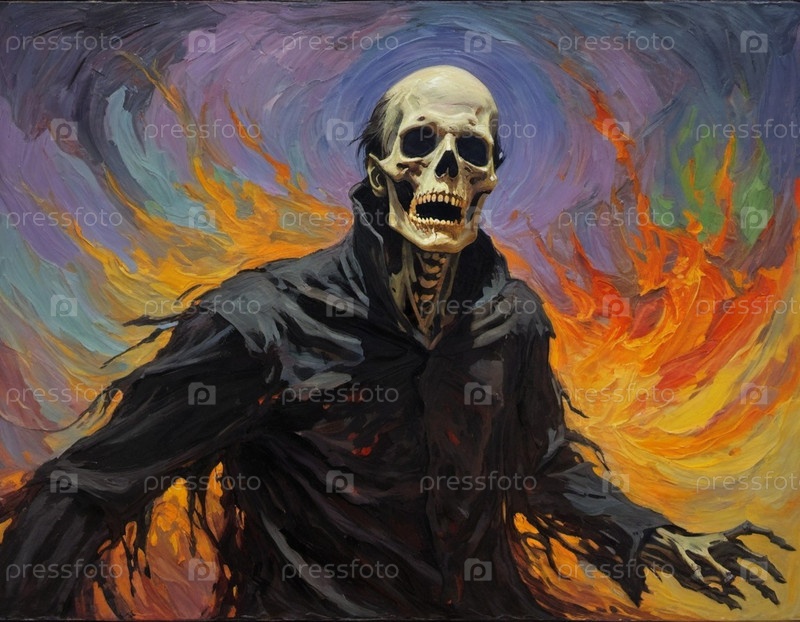 Появляется зловещая фигура со скелетной ухмылкой, окруженная огненными существами, готовыми к темному противостоянию. Генеративный ИИ