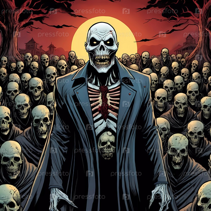 Ужасная фигура уверенно стоит в рваном пальто, обнажая свое скелетообразное тело и леденящую улыбку под сияющей луной, в то время как бесчисленные скелетообразные формы угрожающе вырисовываются на заднем плане, готовые подняться