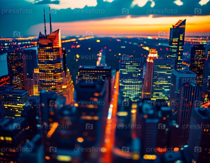 С наступлением сумерек городской горизонт загорается яркими огнями, открывая вид на возвышающиеся небоскребы и освещенные улицы, извивающиеся через огромный мегаполис. Генеративный ИИ