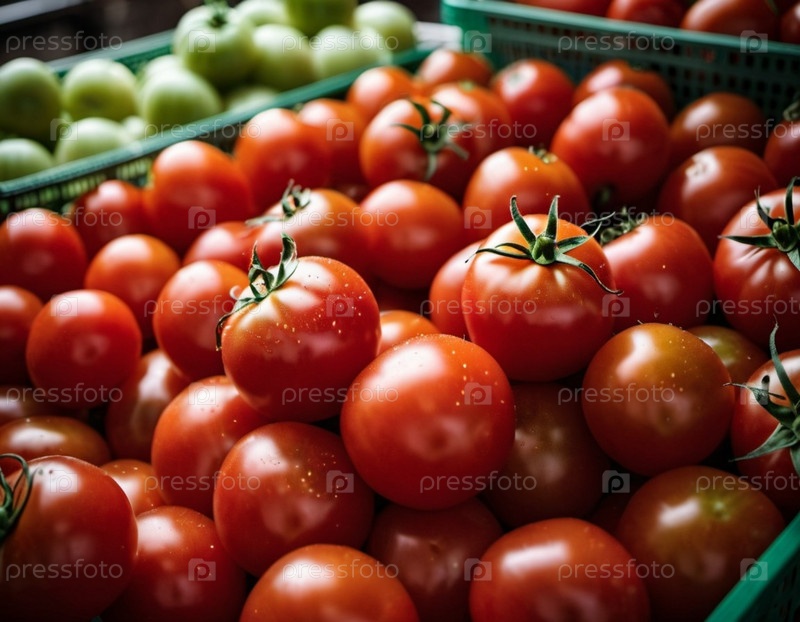 Супермаркет заполнен красными томатами. Томаты сложены гроздьями. Свет отражается от поверхности томатов, подчеркивая яркий цвет и блестящую текстуру. Они были недавно собраны. Генерация ИИ