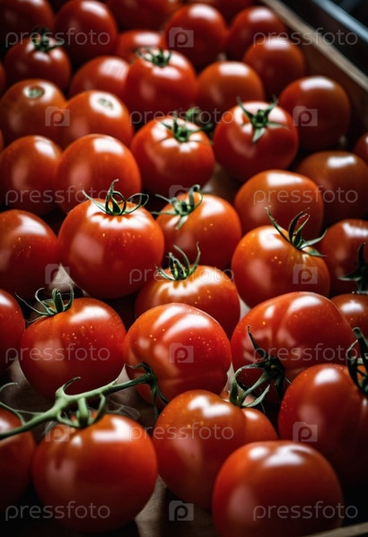 Супермаркет, полный красных томатов. Томаты сложены гроздьями. Свет отражается от поверхности томатов, подчеркивая яркий цвет и блестящую текстуру. Они были недавно собраны. Сгенерировано с помощью ИИ