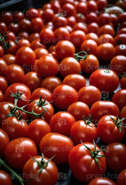 Супермаркет заполнен красными томатами. Томаты сложены гроздьями. Свет отражается от поверхности томатов, подчеркивая яркий цвет и блестящую текстуру. Они были недавно собраны. Генерация ИИ