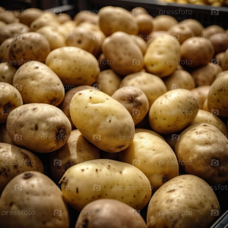 Супермаркет представляет собой яркую витрину со свежим картофелем, сложенным горами, в окружении других продуктов. Покупатели просматривают товары поблизости, наслаждаясь разнообразием. Генеративный ИИ