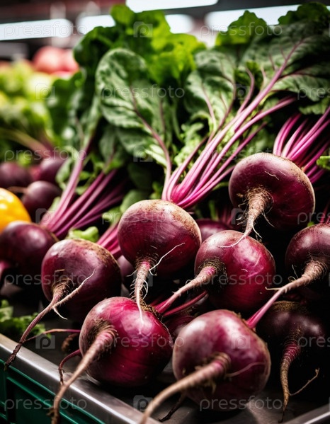 Свекла представлена в отделе продуктов супермаркета, демонстрируя свои насыщенные цвета и приглашая покупателей к выбору. Сезонные овощи предлагают свежесть и качество. Генеративный ИИ