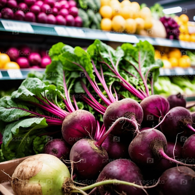 Свекла представлена в отделе продуктов супермаркета, демонстрируя свои насыщенные цвета и приглашая покупателей к выбору. Сезонные овощи предлагают свежесть и качество. Генеративный ИИ