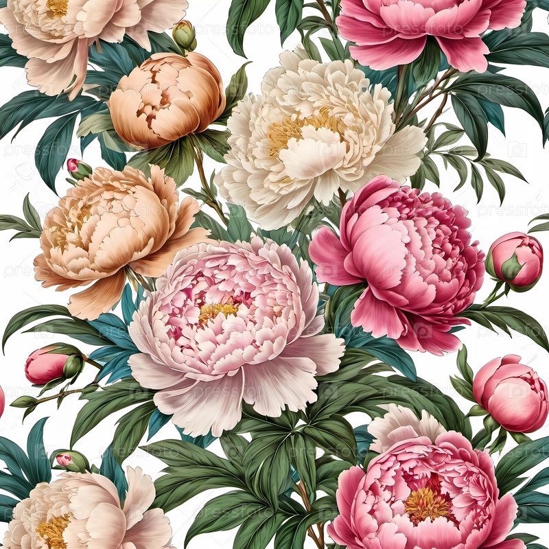 Красочные пионы демонстрируют свои потрясающие цветы в оттенках розового, кремового и кораллового, окруженные сочными зелеными листьями, создавая яркую цветочную композицию. Генеративный ИИ