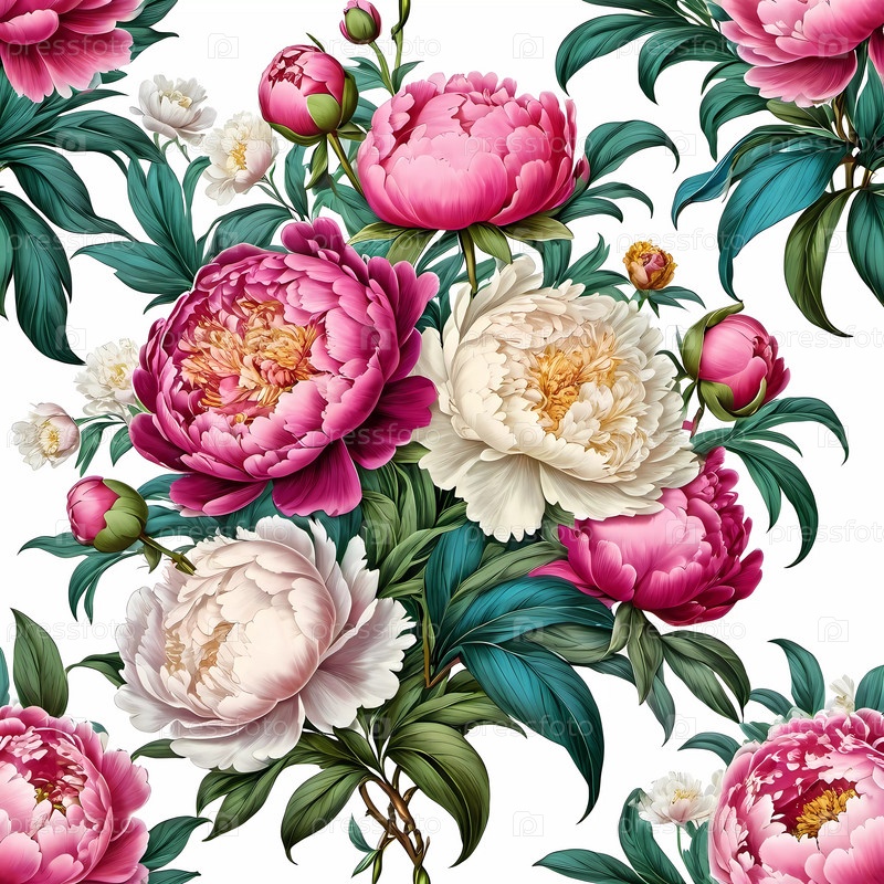 Красочные пионы демонстрируют свои потрясающие цветы в оттенках розового, кремового и кораллового, окруженные сочными зелеными листьями, создавая яркую цветочную композицию. Генеративный ИИ