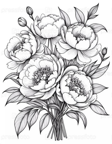 Потрясающая иллюстрация демонстрирует сложную композицию из пионов с пышными листьями, запечатлевшую красоту природы в монохромном дизайне, идеально подходящем для декора или художественных проектов. Генеративный ИИ