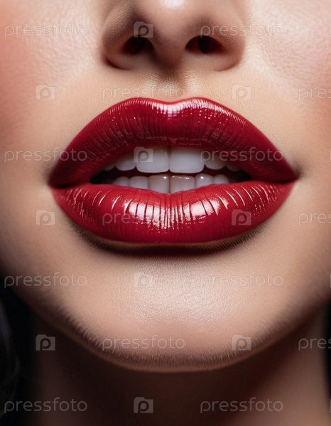Крупный план женских губ, мерцающая бордово-бордовая помада, немного блеска. Губы слегка приоткрыты, открывая вид на белые зубы. Чувственность и сексуальность. Создано с помощью ИИ