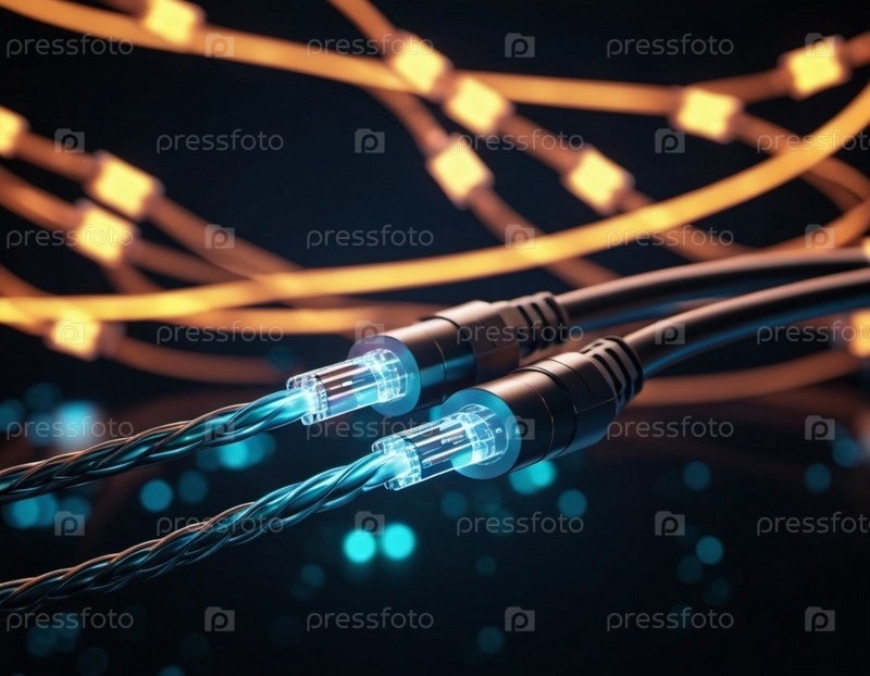 Синие и оранжевые светящиеся провода скручиваются и переплетаются на темном фоне с боке-огнями. Черные кабели и разъемы со светящимися огнями и цепями соединяются, образуя сеть. Создано с помощью ИИ