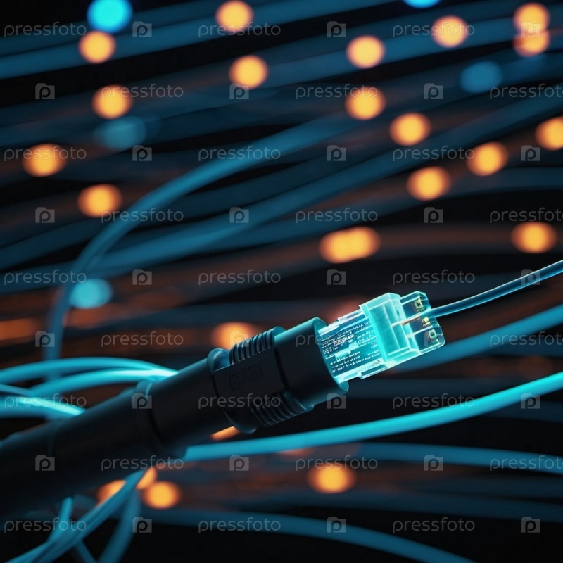 Синие и оранжевые светящиеся провода скручиваются и переплетаются на темном фоне с боке-огнями. Черные кабели и разъемы со светящимися огнями и цепями соединяются, образуя сеть. Создано с помощью ИИ
