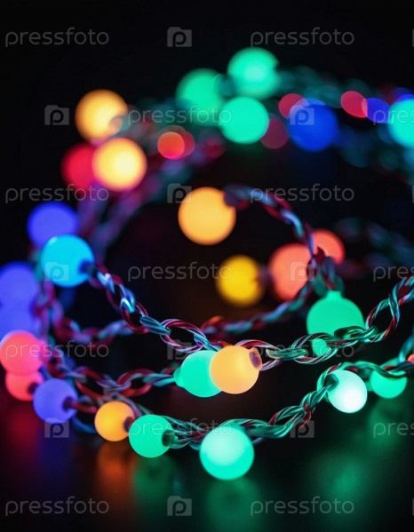 Рождественские огни на темной поверхности. Огни смешивают красный, зеленый, желтый и синий цвета. Огни нанизаны витым образом, создавая ощущение движения и причудливости. Праздничная и привлекательная атмосфера. Рождественский дизайн