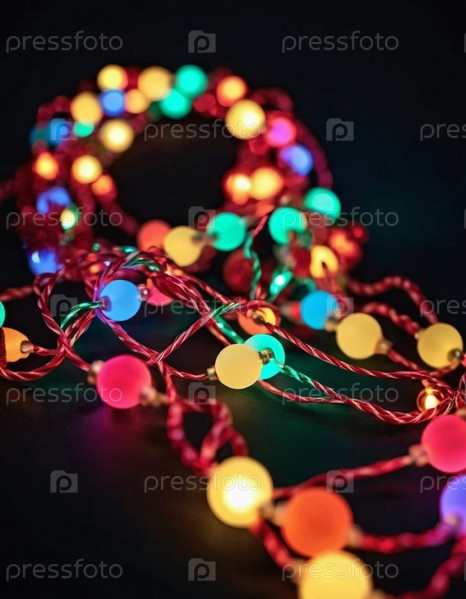 Рождественские огни на темной поверхности. Огни смешивают красный, зеленый, желтый и синий цвета. Огни нанизаны витым образом, создавая ощущение движения и причудливости. Праздничная и привлекательная атмосфера. Рождественский дизайн