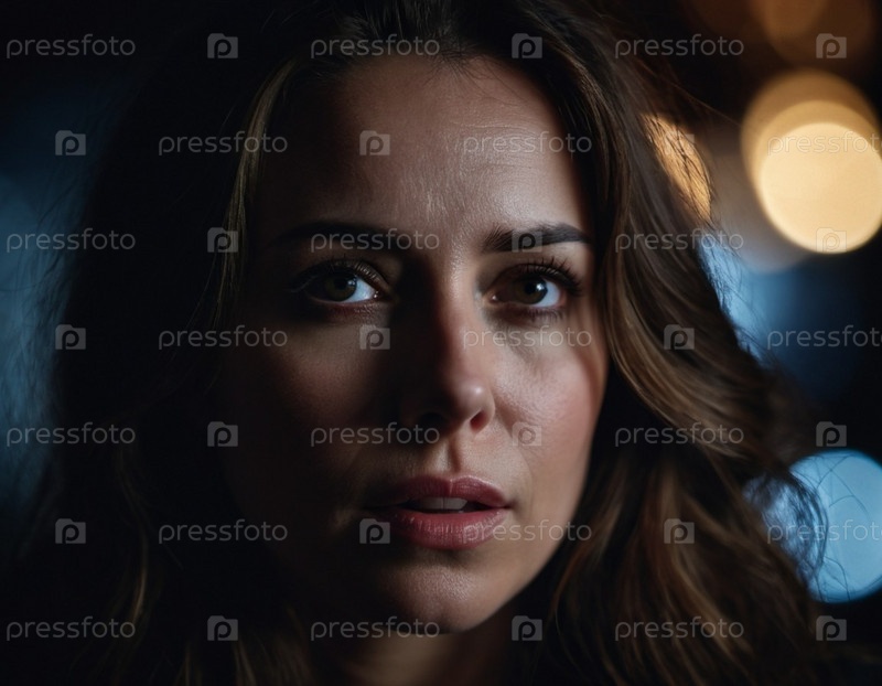 Женщина с нахмуренными бровями и обеспокоенным выражением лица смотрит прямо в камеру. Освещение тусклое, отбрасывает тени вокруг лица, подчеркивая ее стресс. Страх, разочарование, расстройство, беспокойство и задумчивость. ИИ