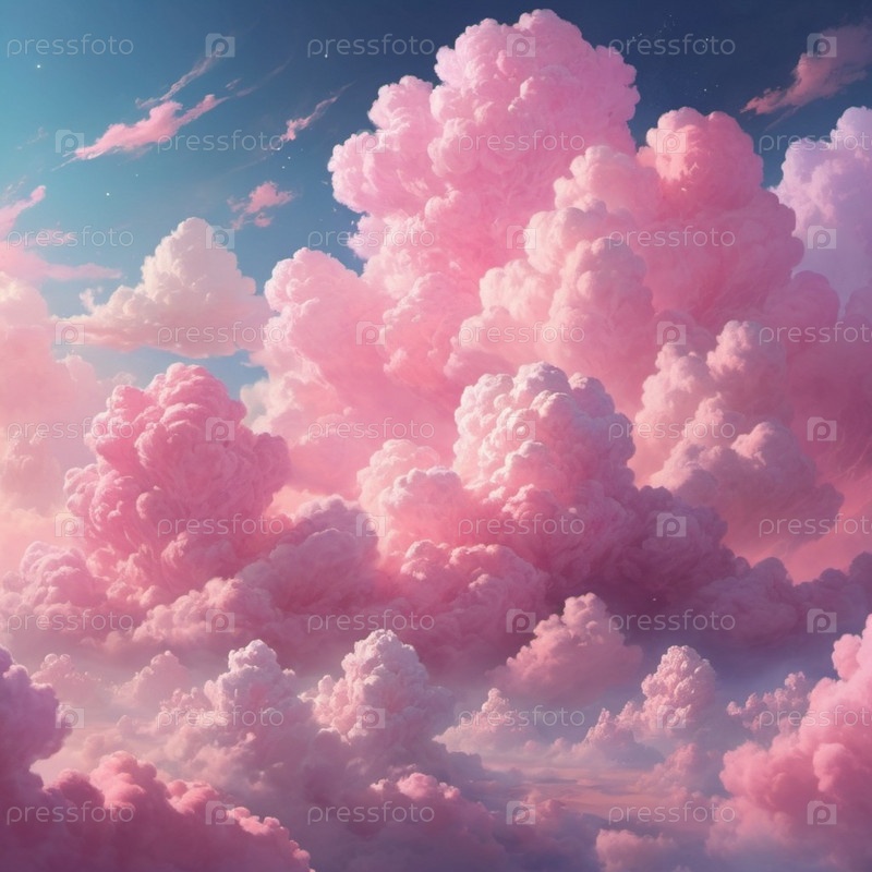 Прекрасный вид на розовые облака в ярком закатном небе. Облака пушистые и полны света, создавая потрясающий визуальный образ. Драматическое нереальное небо с кучевыми и слоистыми облаками в атмосфере. Искусство ИИ