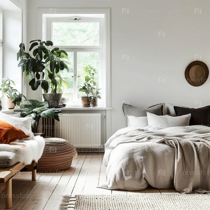 В этой скандинавской спальне установлена удобная кровать с многослойным постельным бельем, стильные растения и минималистский декор, создающий атмосферу умиротворения