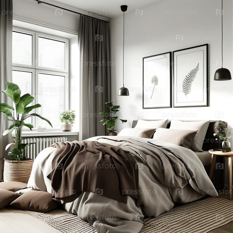 В этой скандинавской спальне установлена удобная кровать с многослойным постельным бельем, стильные растения и минималистский декор, создающий атмосферу умиротворения