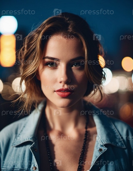 Молодая американка позирует с безмятежным выражением лица, ее волосы мягко обрамляют лицо. Фон освещен теплыми круговыми огнями, создавая мечтательную атмосферу. Яркий вечер в городе. Генеративный ИИ