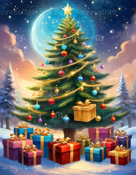Декорированная рождественская елка, украшенная разноцветными игрушками и сложенными подарками, готова к празднованию в уютной праздничной обстановке. упакованные подарки разных цветов. Праздничная атмосфера, теплота и радость. AI