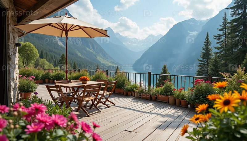 Солнечная терраса, окруженная яркими цветами, располагает к отдыху, предлагая захватывающий вид и уютное место со столиками и стульями. Терраса украшена цветущими цветами и живописными горами. Генеративный ИИ