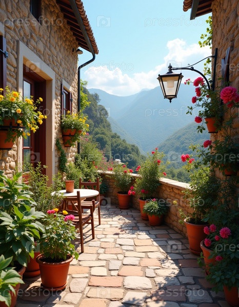 Солнечная терраса, окруженная яркими цветами, располагает к отдыху, предлагая захватывающий вид и уютное место со столиками и стульями. Терраса украшена цветущими цветами и живописными горами. Генеративный ИИ