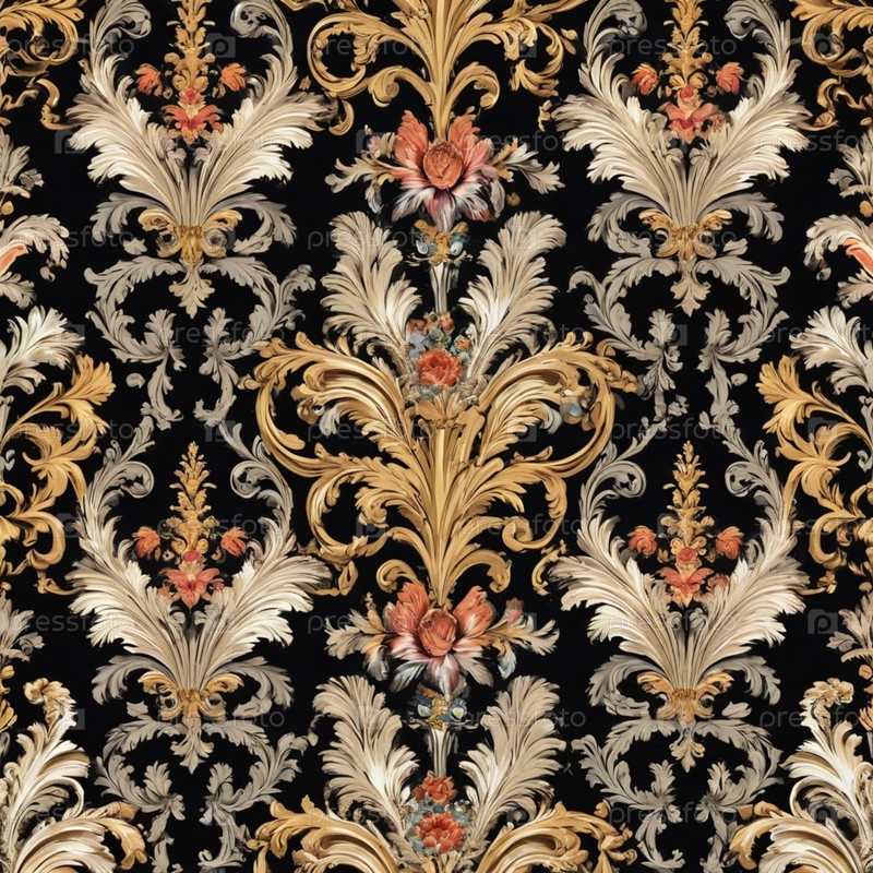 Цветочный узор, вдохновленный дизайном барокко и рококо. сложные золотые мотивы цветут на богатом черном фоне, создавая элегантную эстетику. генеративный арт-объект AI