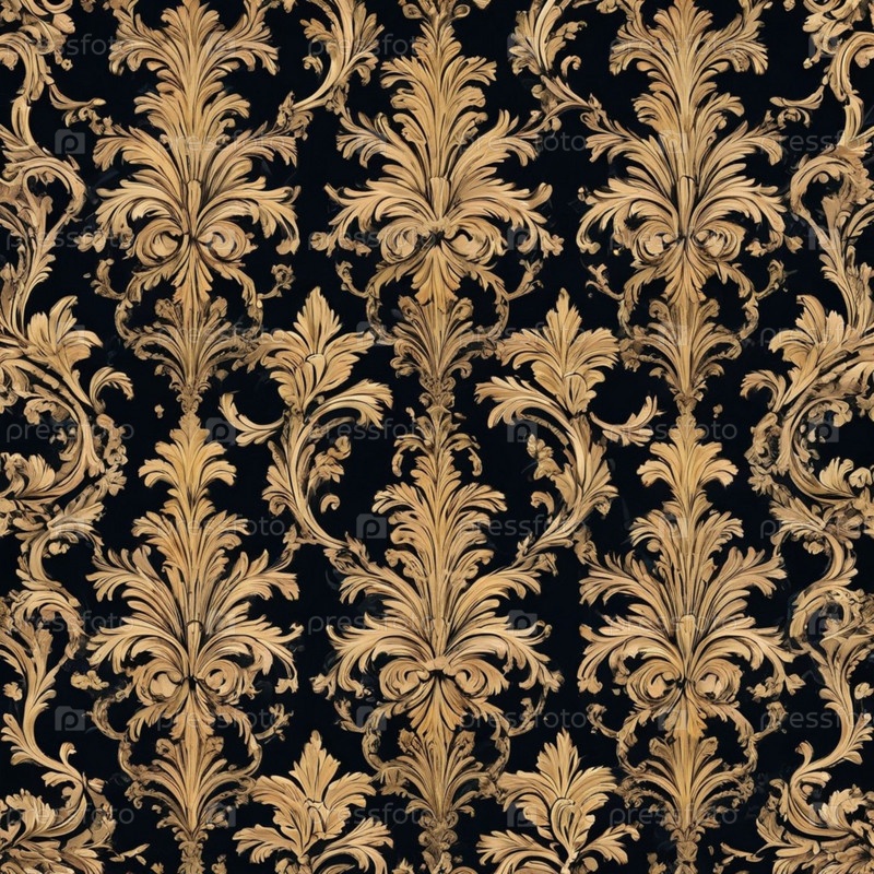 Цветочный узор, вдохновленный дизайном барокко и рококо. сложные золотые мотивы цветут на богатом черном фоне, создавая элегантную эстетику. генеративный арт-объект AI
