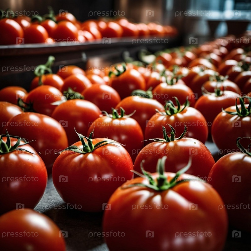 Супермаркет заполнен красными томатами. Томаты сложены гроздьями. Свет отражается от поверхности томатов, подчеркивая яркий цвет и блестящую текстуру. Они были недавно собраны. Генерация ИИ