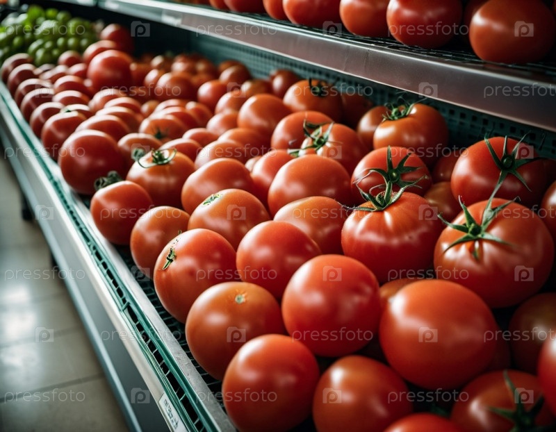 Супермаркет заполнен красными томатами. Томаты сложены гроздьями. Свет отражается от поверхности томатов, подчеркивая яркий цвет и блестящую текстуру. Они были недавно собраны. Генерация ИИ