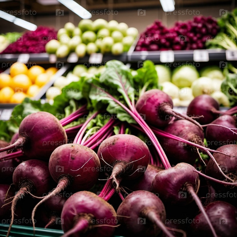 Свекла представлена в отделе продуктов супермаркета, демонстрируя свои насыщенные цвета и приглашая покупателей к выбору. Сезонные овощи предлагают свежесть и качество. Генеративный ИИ