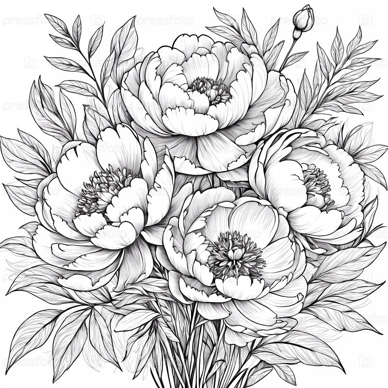 Потрясающая иллюстрация демонстрирует сложную композицию из пионов с пышными листьями, запечатлевшую красоту природы в монохромном дизайне, идеально подходящем для декора или художественных проектов. Генеративный ИИ
