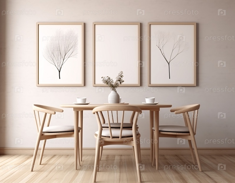 Макет рамы в современной минималистской комнате со всей белой мебелью, включая деревянный стол и стулья в обеденной зоне