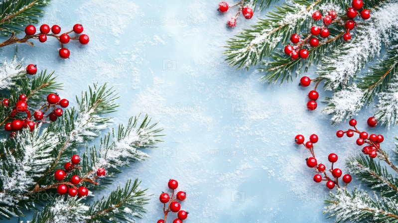 Рождественские украшения с заснеженными сосновыми ветками и красными шарами