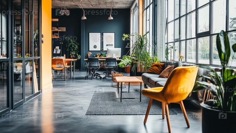 Просторный и современный офис в стиле лофт с ярким желтым диваном