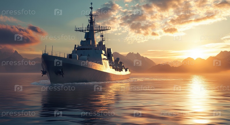 Почувствуйте захватывающую дух красоту и мощь военных кораблей, курсирующих по спокойным морям на закате, где сочетание природы и военной мощи создает захватывающий морской пейзаж