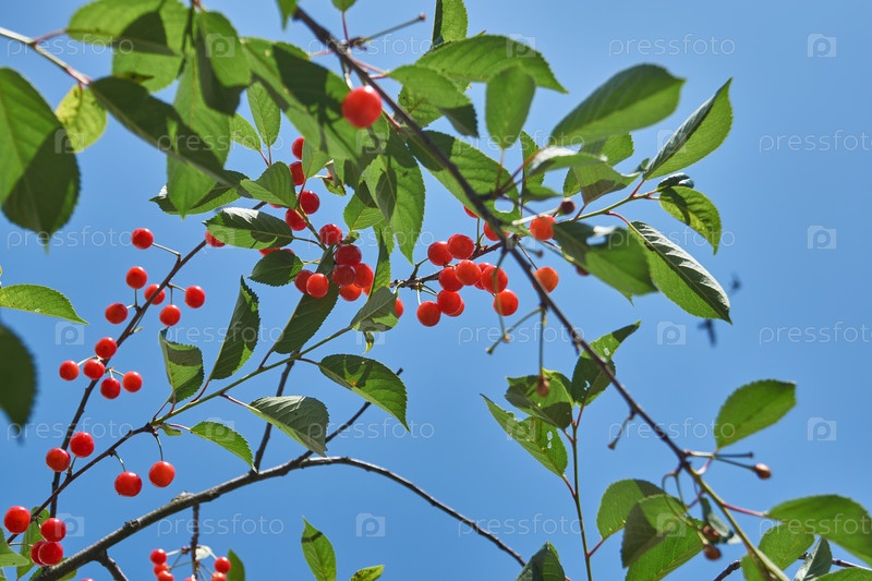Вишня на фоне голубого неба и зеленых листьев. Вишня зреет в саду