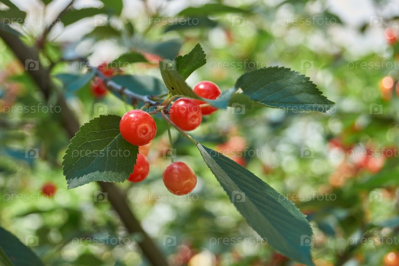 Вишня на фоне голубого неба и зеленых листьев. Вишня зреет в саду