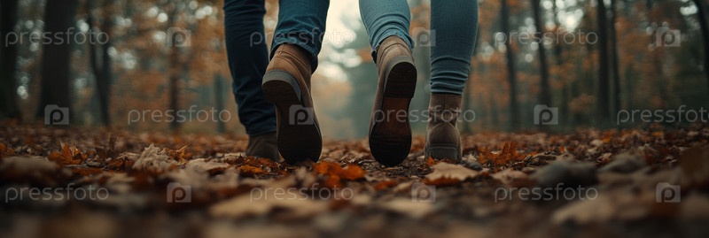 Человек идет по тихой лесной тропинке, покрытой яркими осенними листьями под мягким солнечным светом