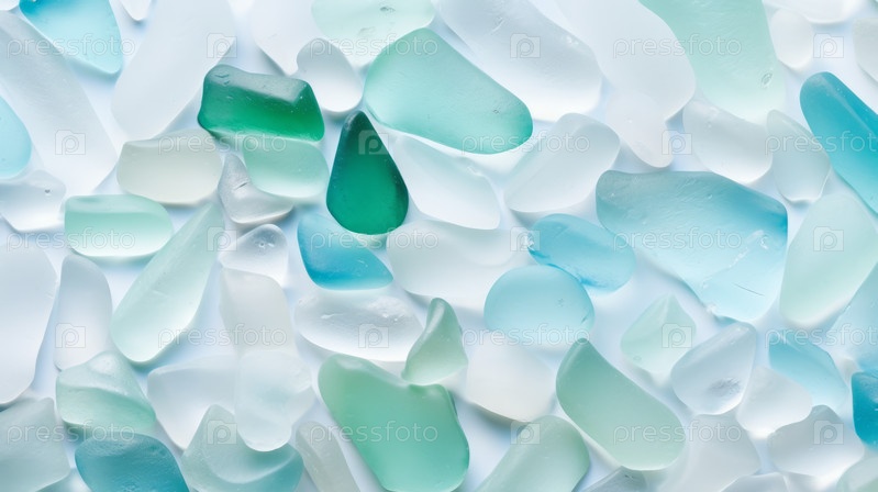 Летний фон из вида сверху на морское стекло. Битое стекло из океана. Морской узор. Океаническая мозаика. Естественные цвета синего, зеленого, белого, найденные на побережье