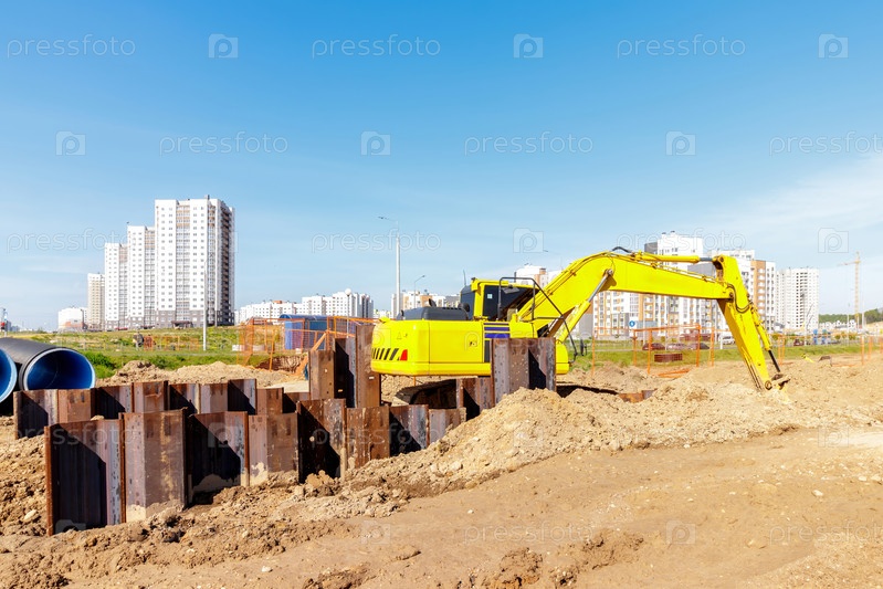 Экскаватор работает на строительной площадке на фоне высотных зданий под ясным небом